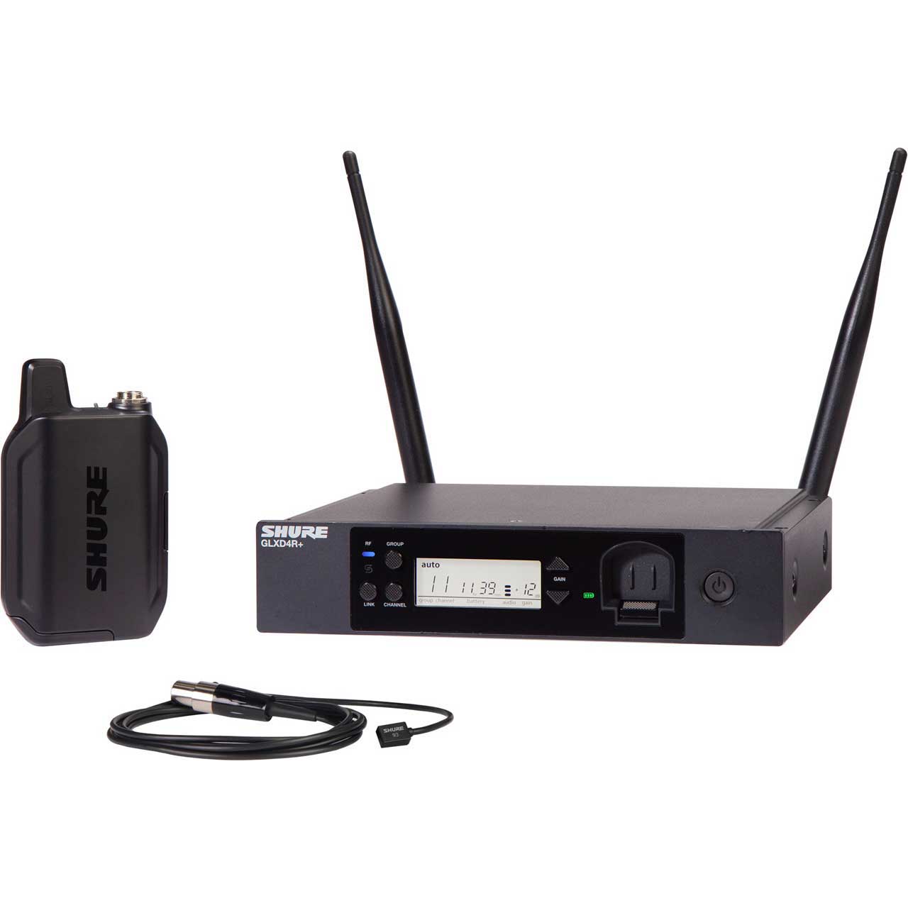 The Shure GLX-D+93 Dual Band Wireless Rack System features the miniature wearable WL93 lavalier microphone for spoken word applications and the GLXD4R+ half-rack receiver.Â