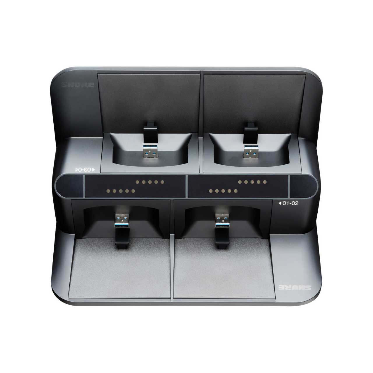 Shure SBC450 4-bay Networked Docking Station Charges Up To 4 ULXD6 or ULXD8 Transmitters with SB900B Battery. Gear by The Penn Group.