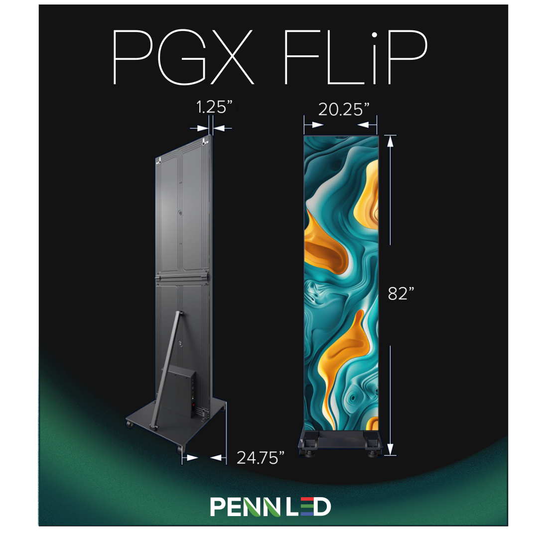 PGX-FLiP LED poster is a portable display designed for your lobby, retail store, church, school, music venue, airport, event space, or rental portfolio.